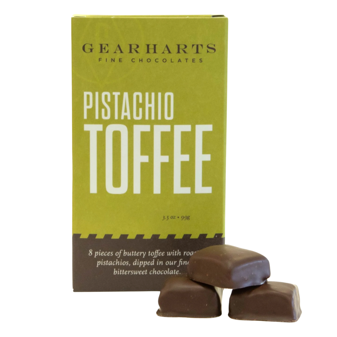 One of our bestsellers. Rich, buttery toffee loaded with roasted, lightly salted California pistachios and bathed in our best bittersweet chocolate. Gluten free!